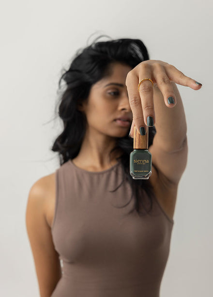 deep olive green nail polish hand swatch on medium skin tone holding sienna bottle