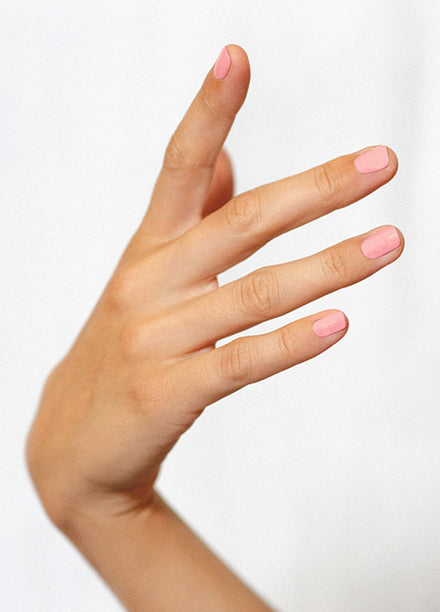 Cherry blossom pink nail polish hand swatch on fair skin tone